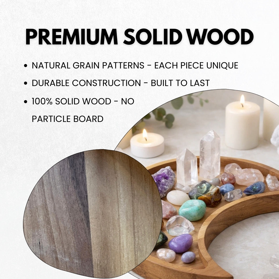 Ideal crystal holder for stones, minerals, and healing crystals. The natural wood warmth beautifully complements earth-tone and colorful crystals while keeping your collection elegantly organized with room for both large and small pieces.