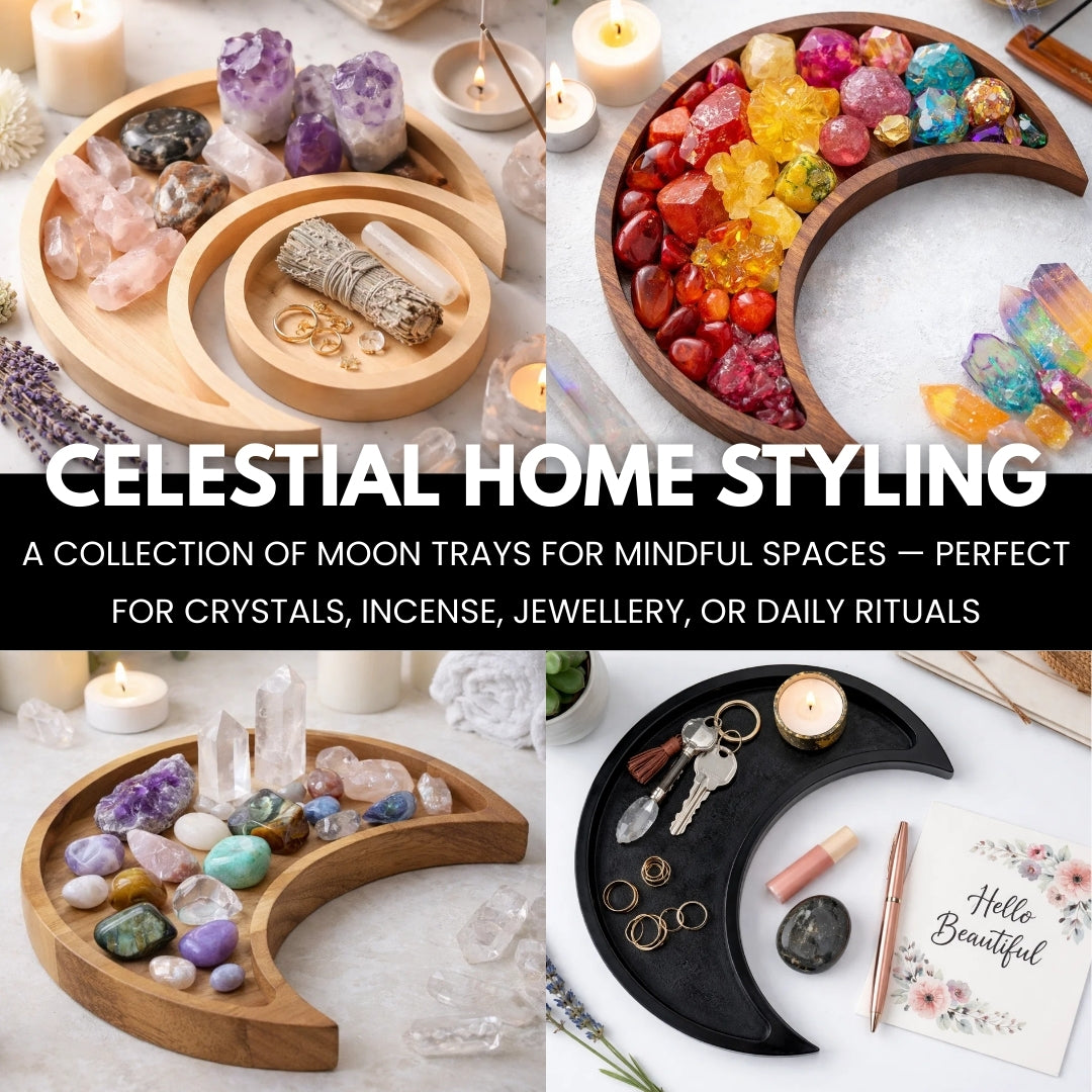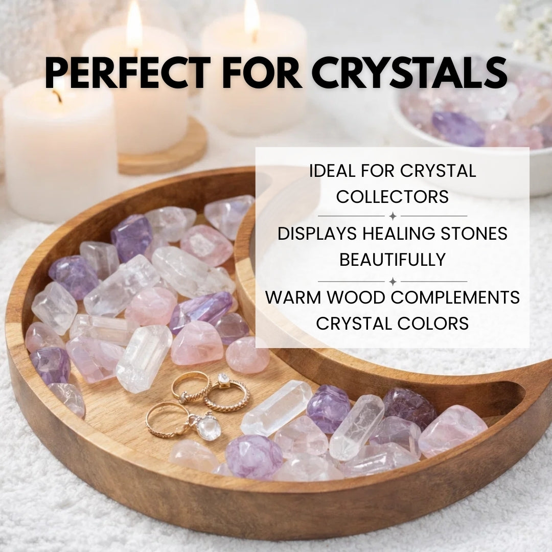 Spacious 10.5" x 5" moon-shaped tray holds multiple crystals, jewelry pieces, or spiritual items. The substantial size provides ample room for collectors building their crystal collection with space for large and small pieces.
