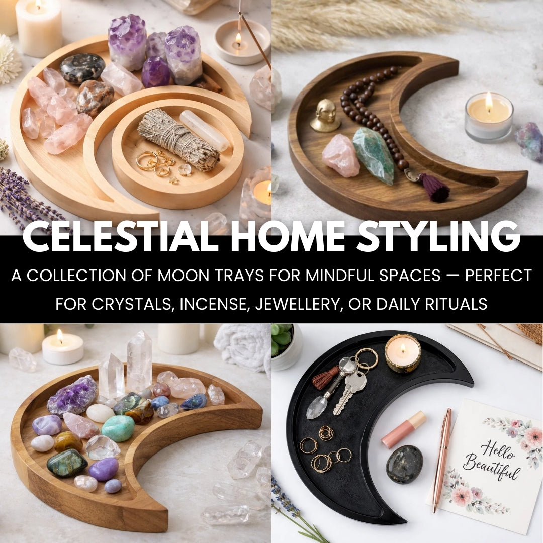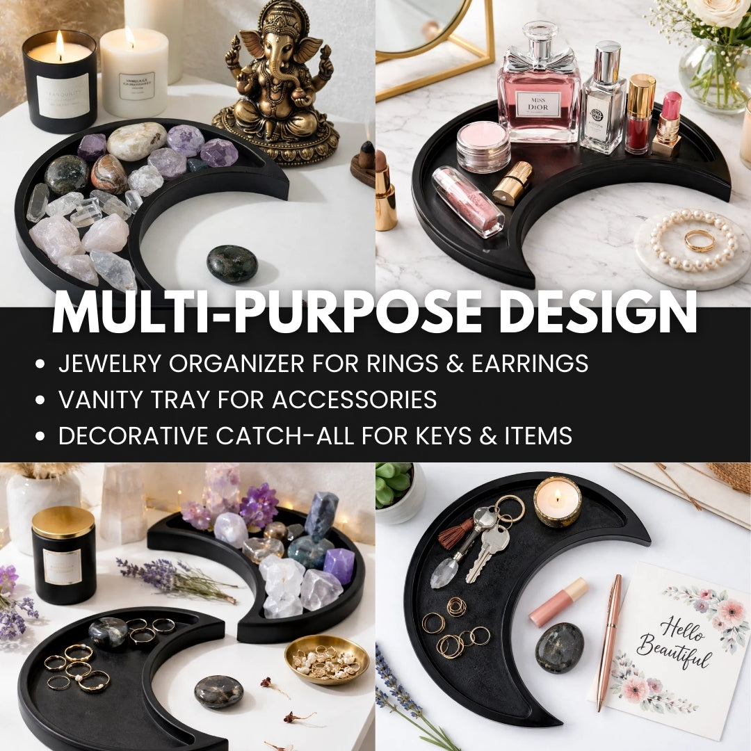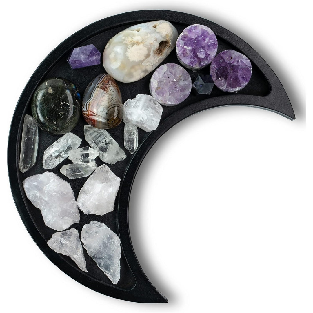 Spacious 10.5" x 5" moon-shaped tray holds multiple crystals, jewelry pieces, or spiritual items. The substantial size provides ample room for collectors building their crystal collection with space for large and small pieces.