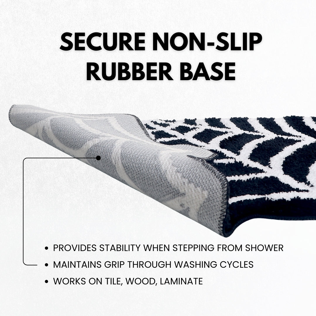 Non-slip rubber backing helps keep the mat securely in place on bathroom floors, tile, or hardwood surfaces. Provides added stability when stepping out of the shower while the absorbent microfiber surface soaks up moisture effectively.